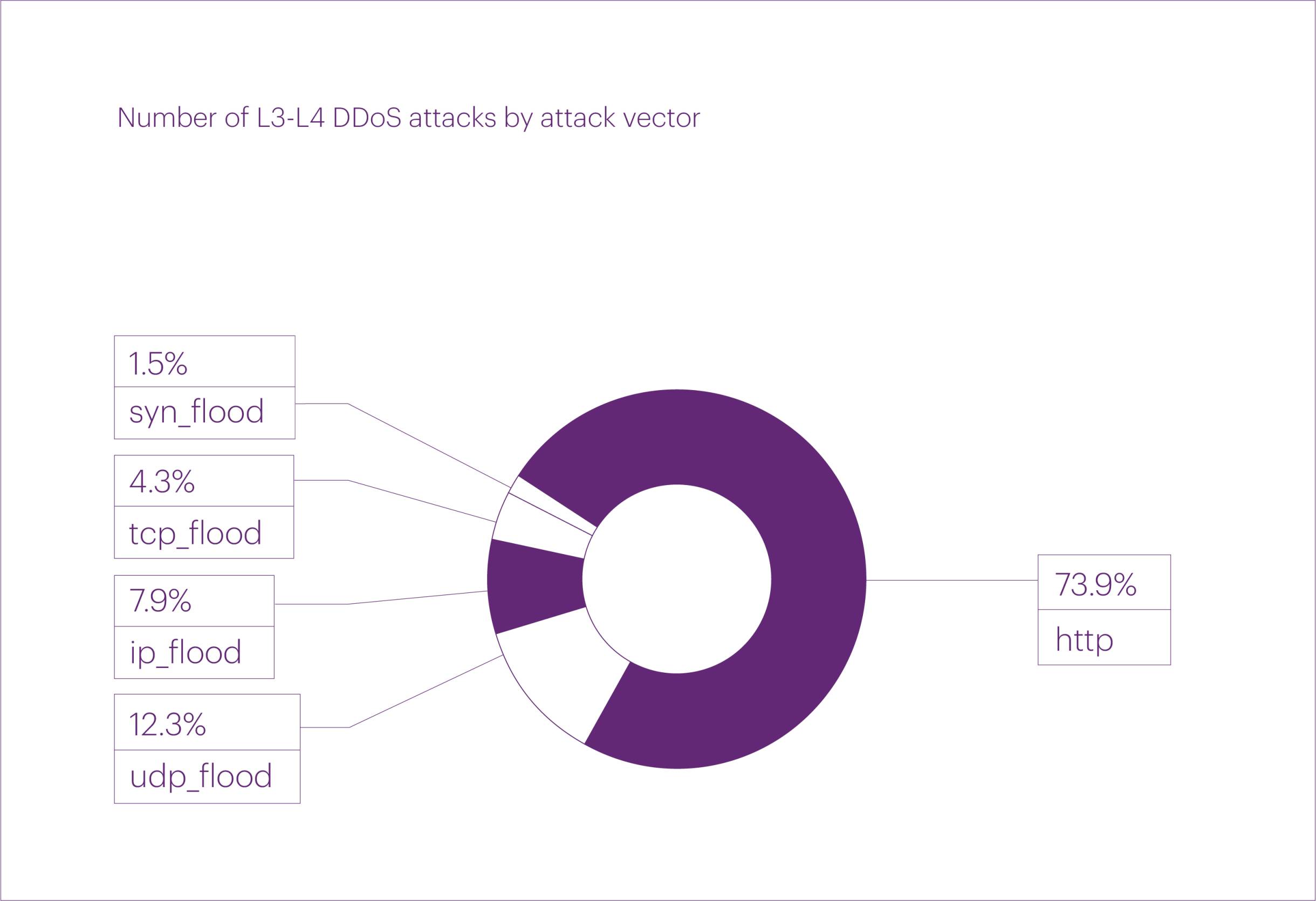 If we look at the pure DDoS attack vectors in Q3, the largest share was accounted for by HTTP — that is, application-layer attacks — which made up 73.9% of all recorded incidents. The second most common was UDP flood with a share of 12.3%, followed by IP flood with 7.9%. Notably, no ICMP flood attacks were recorded throughout Q3.