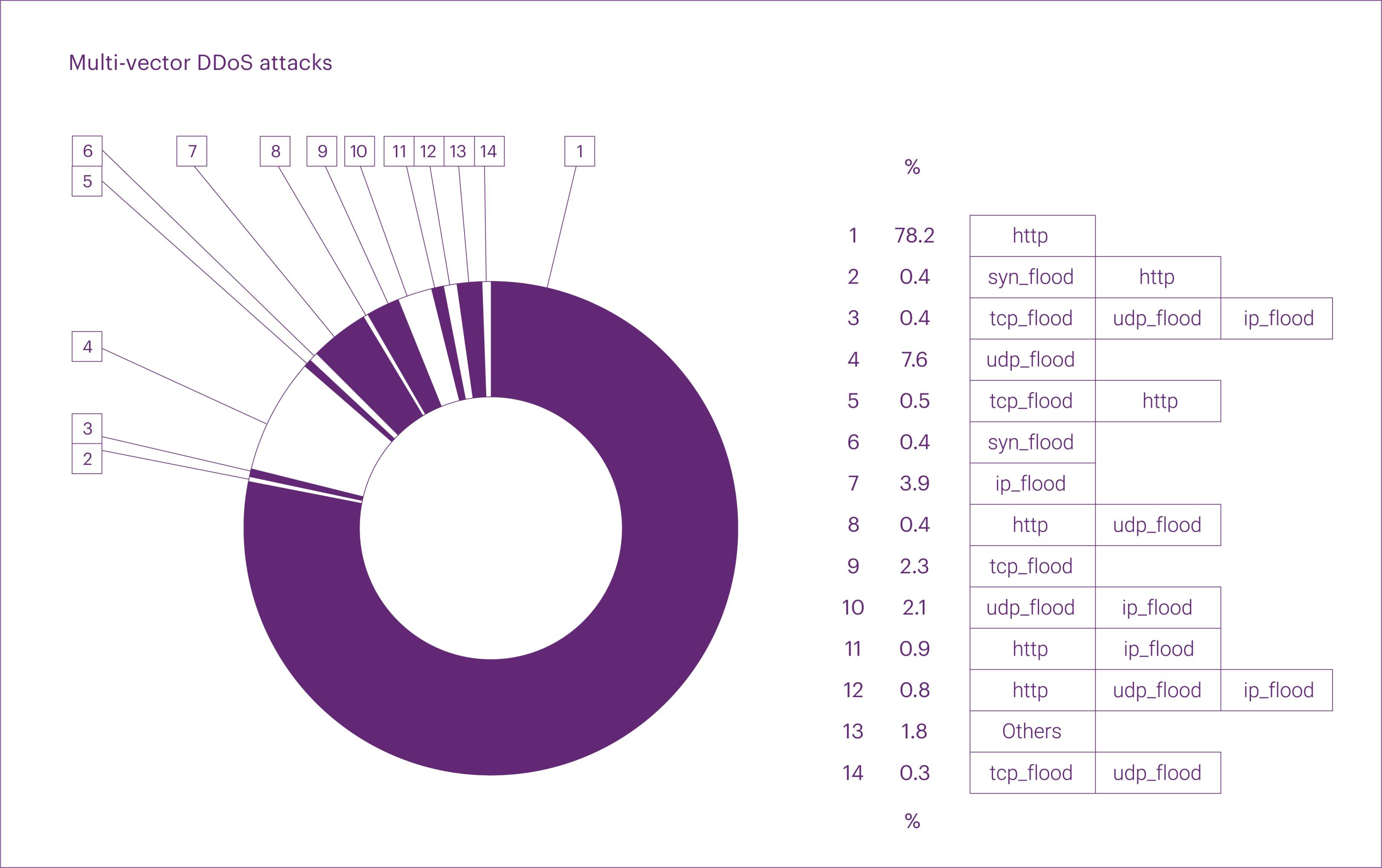 Under the new analysis methodology, multi-vector attacks accounted for 7.5% of all incidents in Q3 2025. About half of them (3.8% of all incidents) combined L3-L4 DDoS with L7 DDoS.