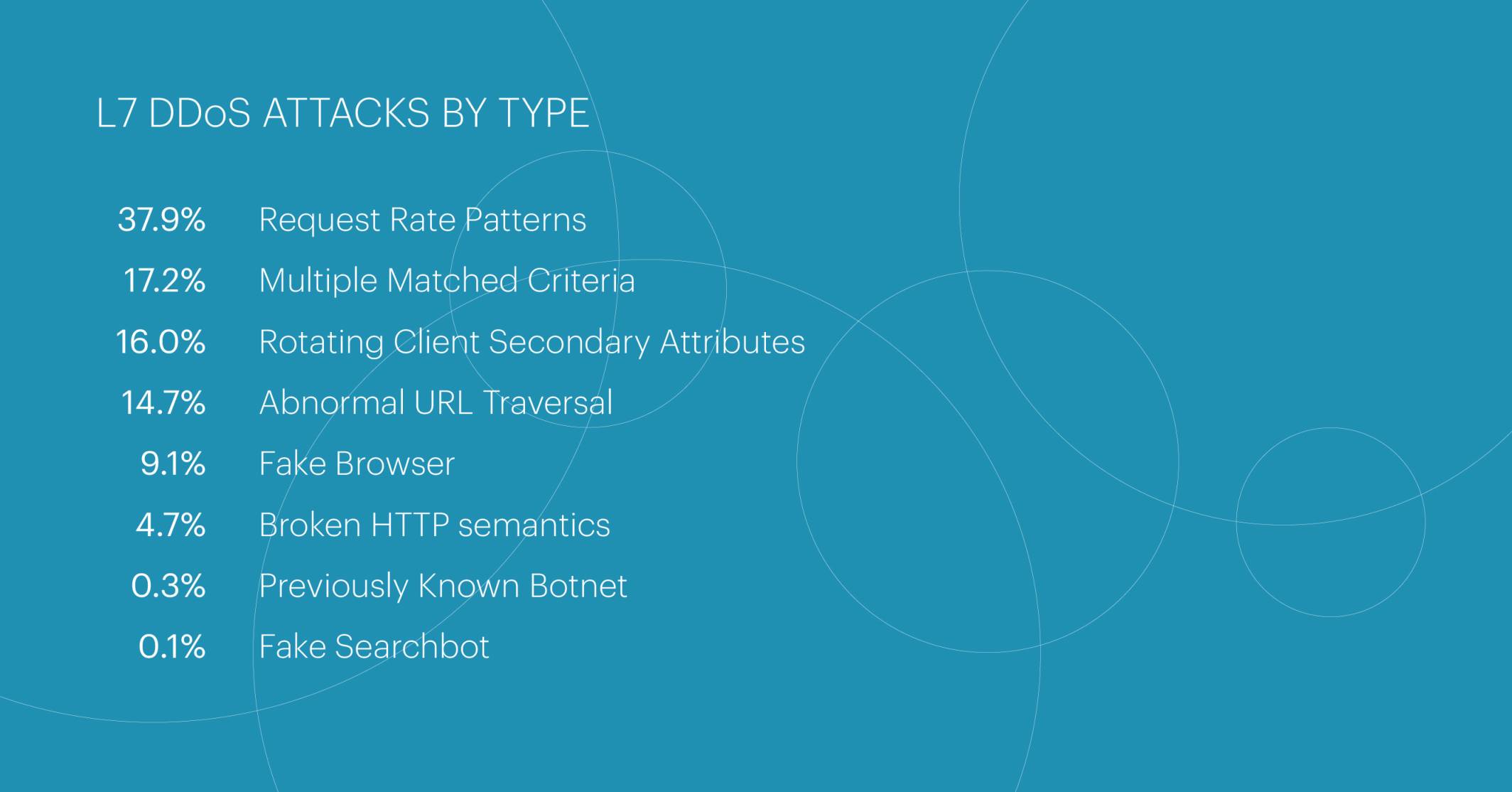 The most common class of L7 DDoS attacks in Q3 was Request Rate Patterns (37.9%), characterized by request frequencies that differ from the expected behavior of legitimate users. The second most common was the multi-class category Multiple Matched Criteria (17.2%), followed by Rotating Client Secondary Attributes (16.0%) — attacks involving unusual sets of request headers.