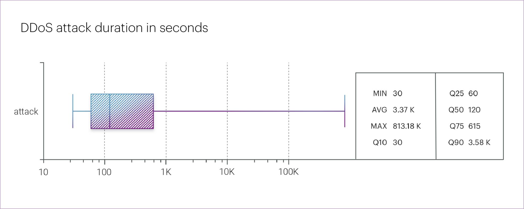 The average attack duration in Q3 was 3,370 seconds (about 56 minutes), while the median duration was only 2 minutes.