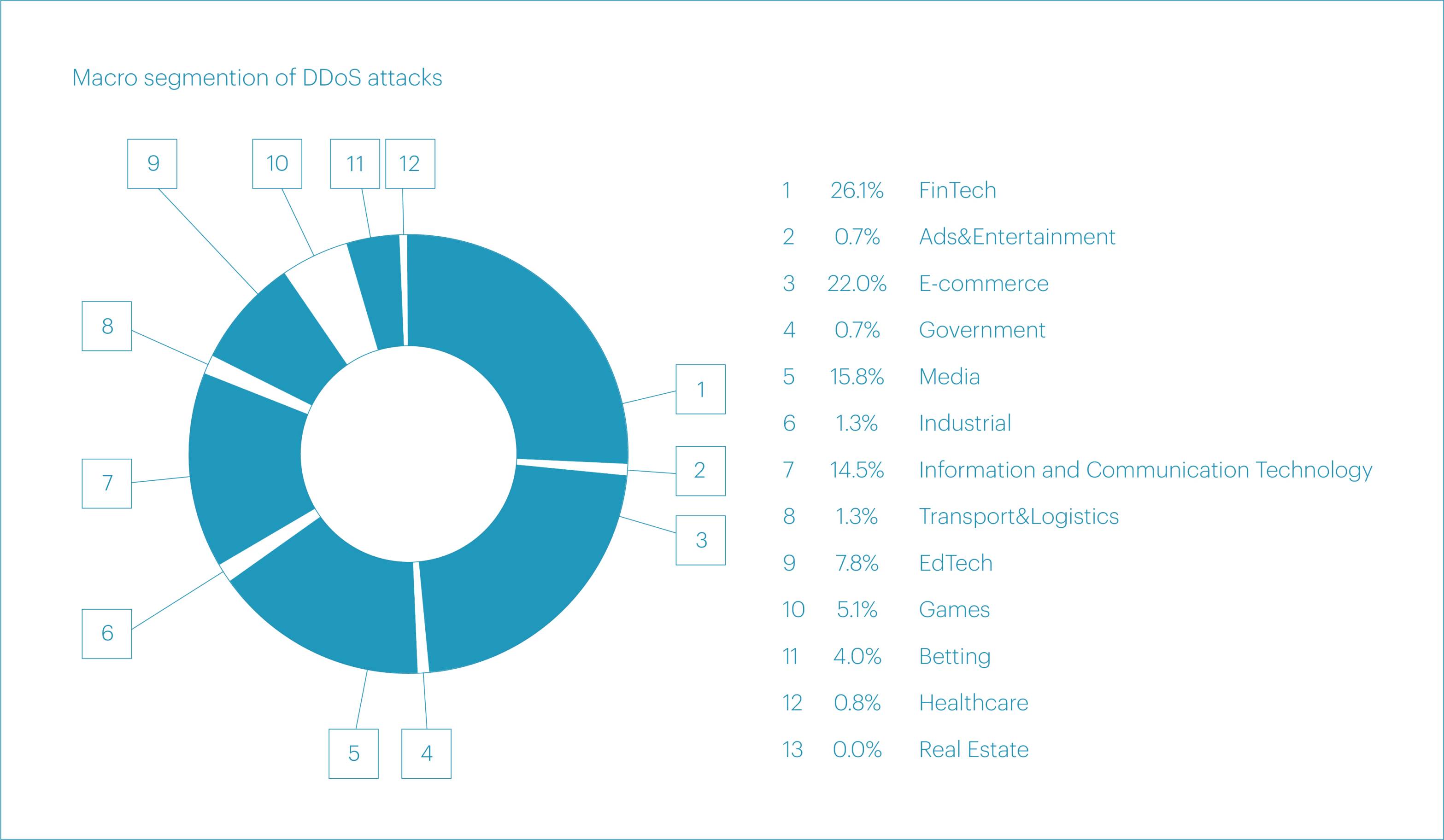 In Q3 2025, DDoS attacks most frequently targeted the FinTech (26.1%), E-commerce (22.0%), Media (15.8%), and Information and communication technology (14.5%) segments. Together, these four accounted for 78.3% of all attacks recorded during the reporting period.