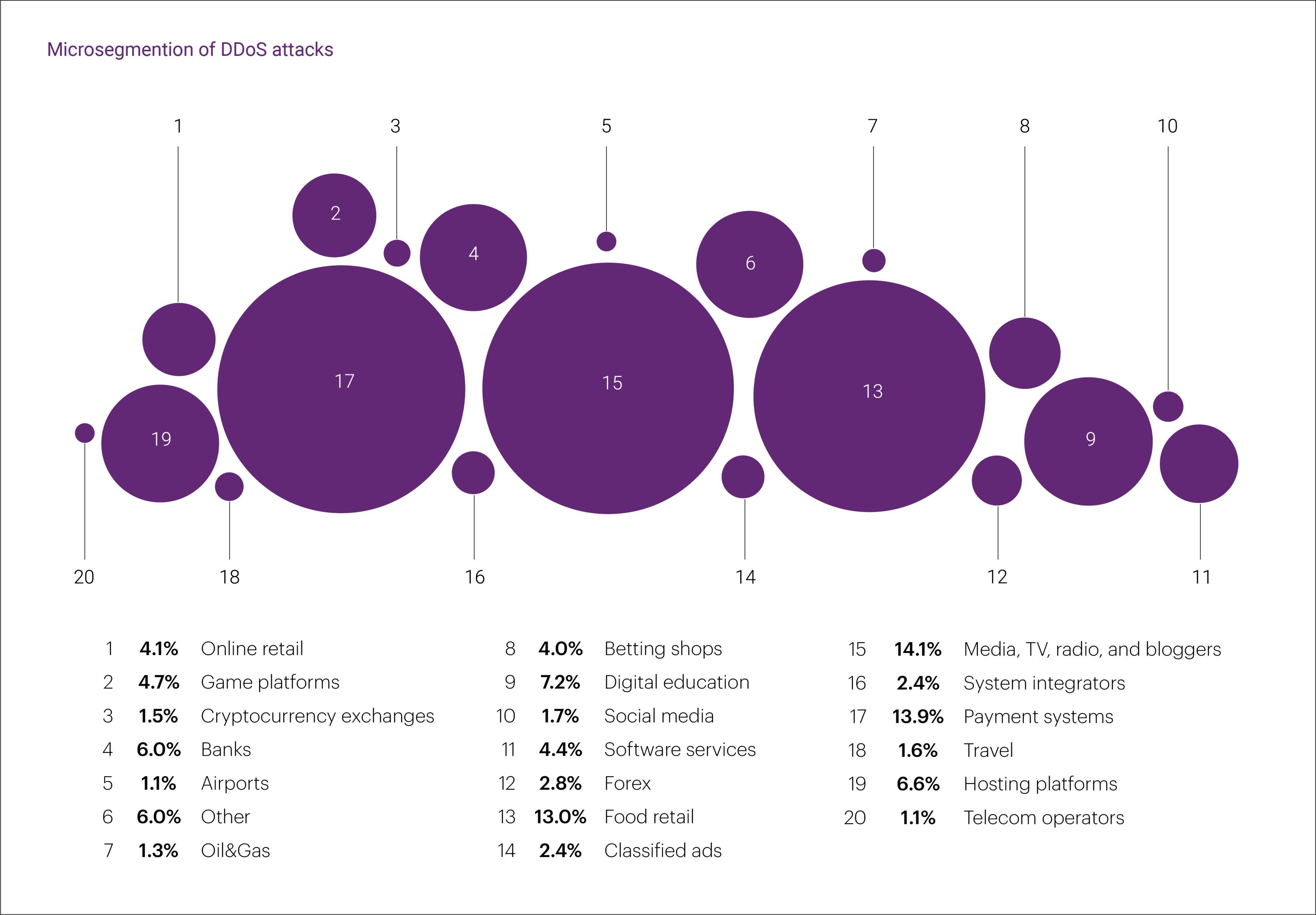 Looking at a more detailed breakdown, the largest number of DDoS attacks in Q3 targeted the following microsegments: Media, TV, radio, and bloggers (14.1%), Payment systems (13.9%), Food retail (13.0%), Digital education (7.2%), and Hosting platforms (6.6%). Combined, these five microsegments represented more than half (54.8%) of all attacks.