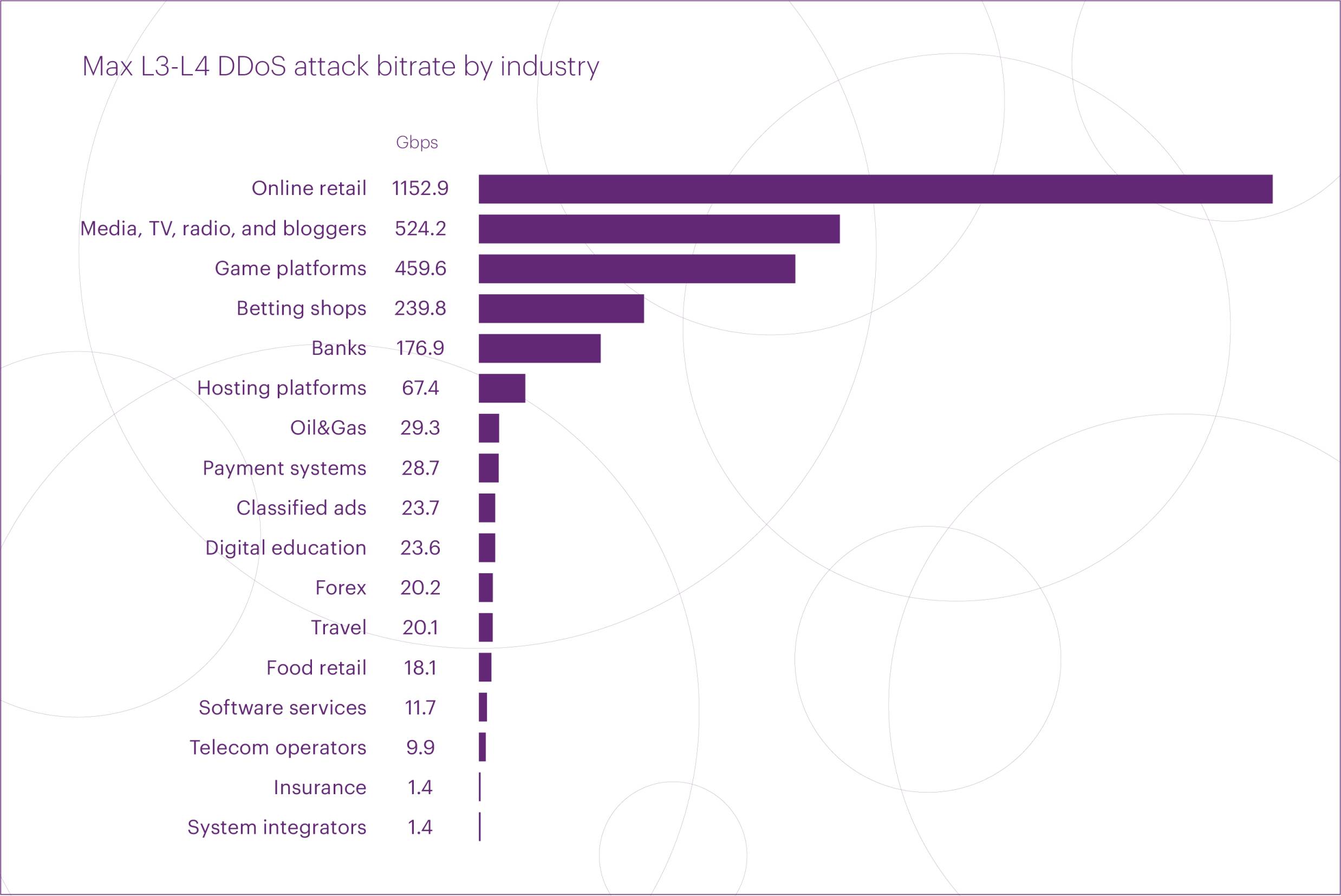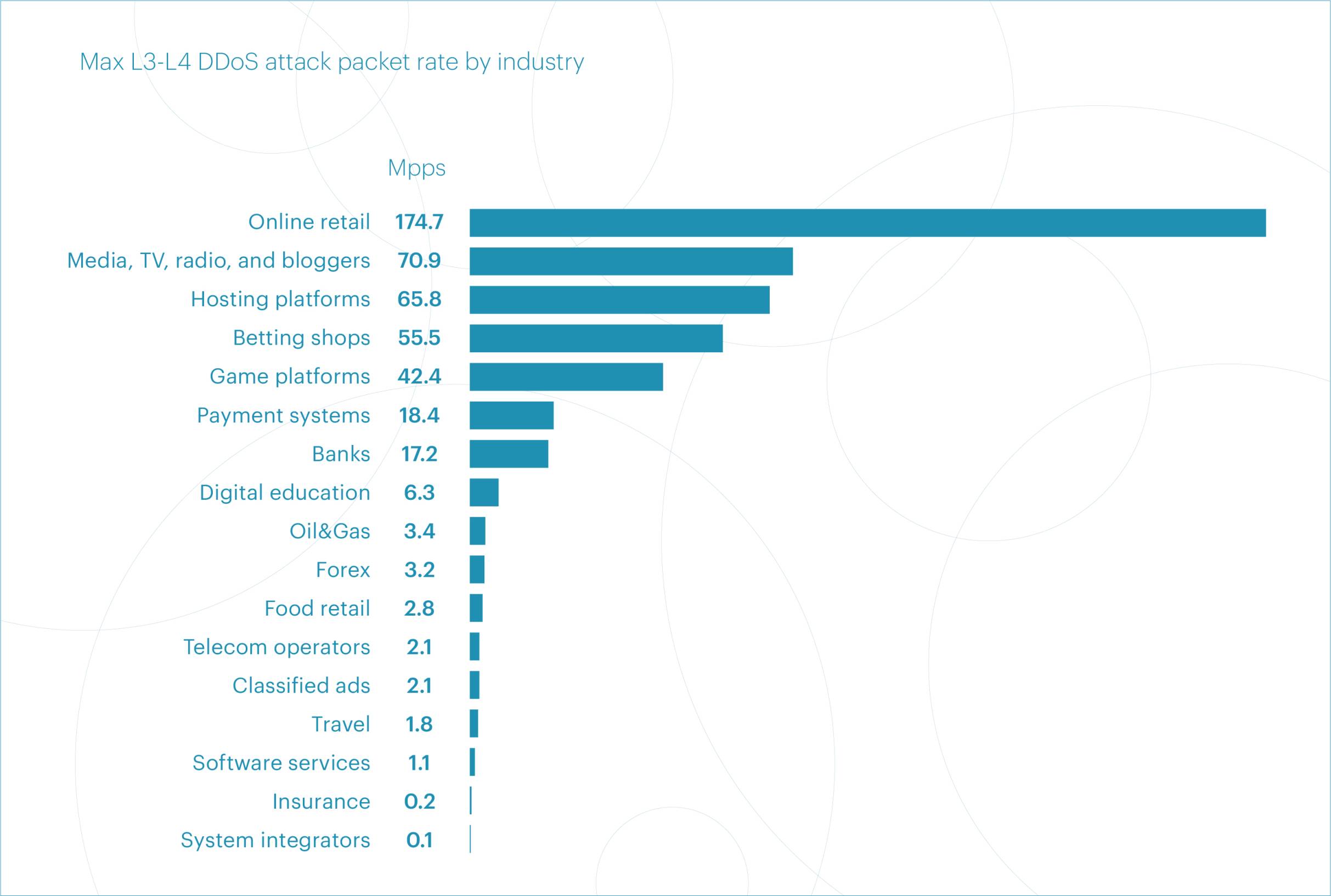 The ranking by peak packet rate looked very similar: Online retail (174.7 Mpps), Media, TV, radio, and bloggers (70.9 Mpps), Hosting platforms (65.8 Mpps), Betting shops (55.5 Mpps), and Gaming platforms (42.4 Mpps).