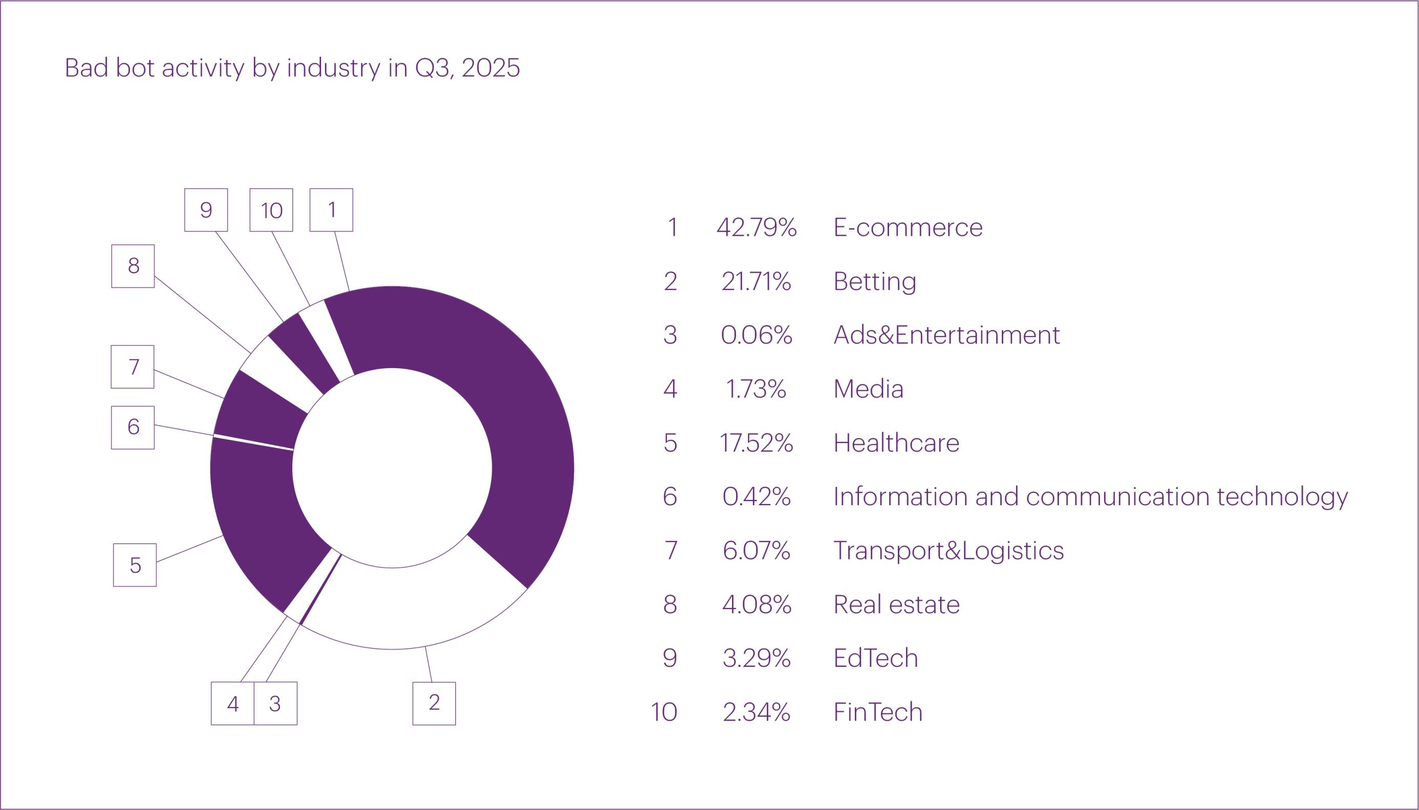 In Q3 2025, bad bot attacks primarily targeted the E-commerce (42.79%) and Betting (21.71%) segments, which have traditionally led this ranking. The Healthcare segment unexpectedly ranked third this quarter (17.52%), mainly due to a significant volume of traffic directed at a single resource.