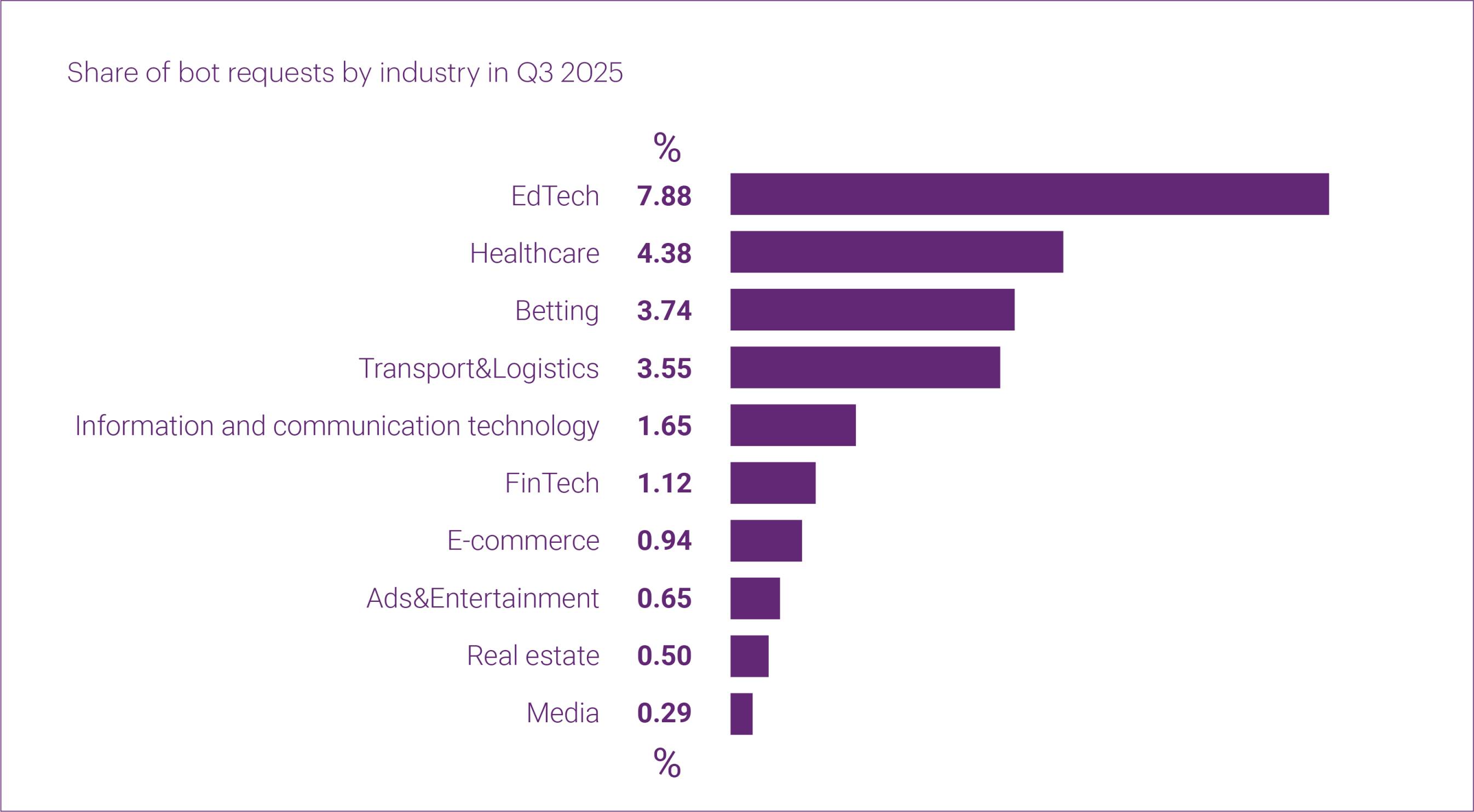 The bot index continues to vary across industries. The three segments most affected by bot traffic in Q3 were Digital education (7.88%), Healthcare (4.38%), and Betting (3.74%).