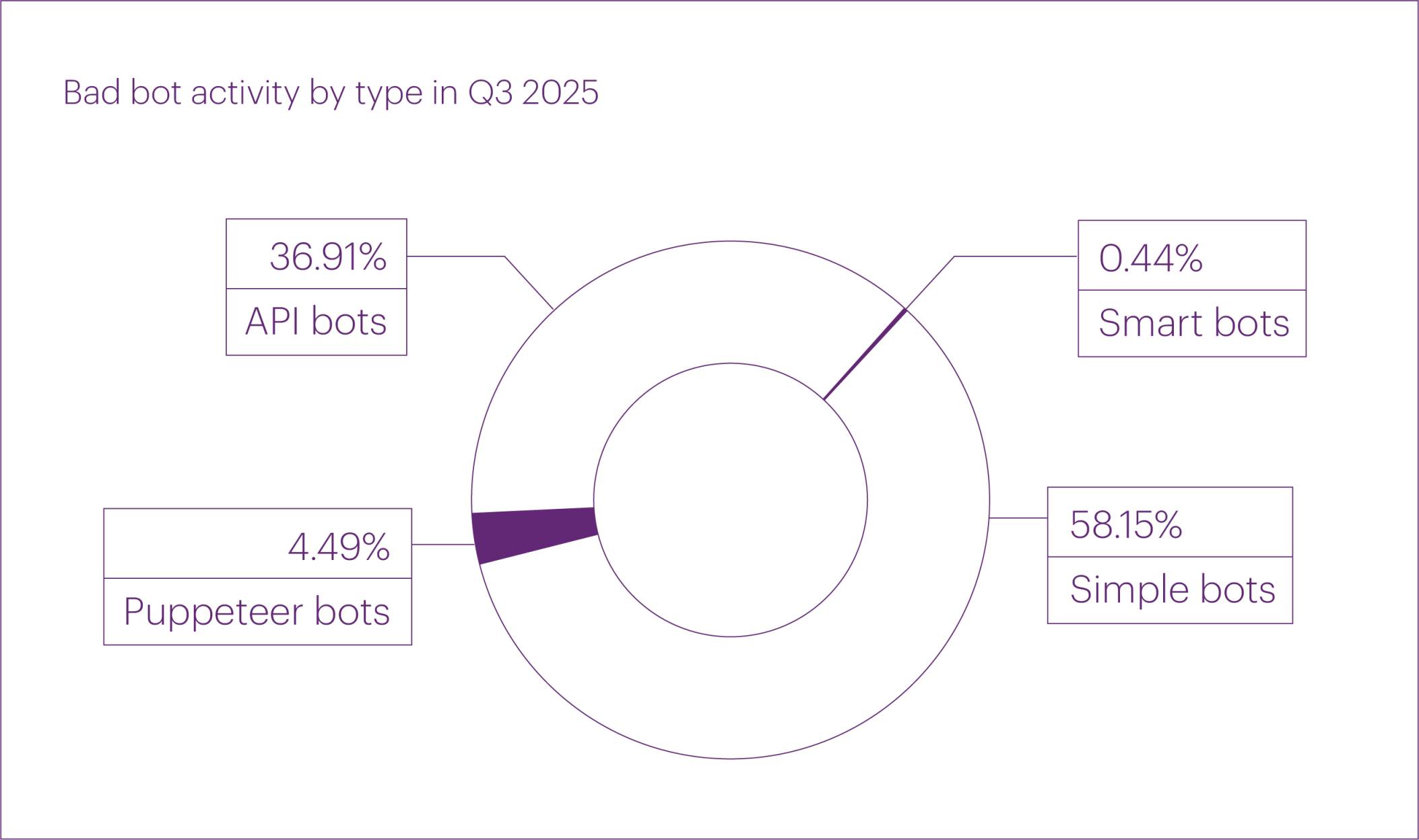 In Q3 2025, compared to Q2, the share of simple bots (59.18% → 58.15%) and API bots (38.01% → 36.91%) slightly decreased, while the share of puppeteer bots (2.58% → 4.49%) and smart bots (0.23% → 0.44%) nearly doubled.