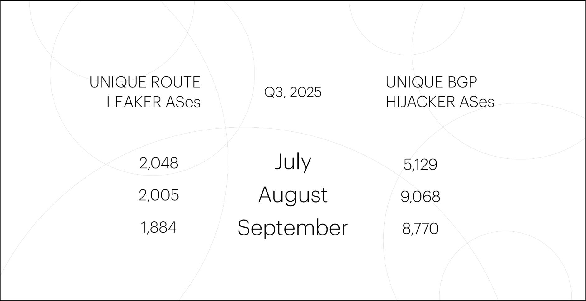 The number of unique autonomous systems (ASes) responsible for route leaks in Q3 2025 remained roughly the same as in the previous several quarters. However, the number of unique ASes involved in BGP hijacks was slightly lower than in prior periods. This decrease in activity was primarily observed in July, while in August and September, the figures returned to typical levels.