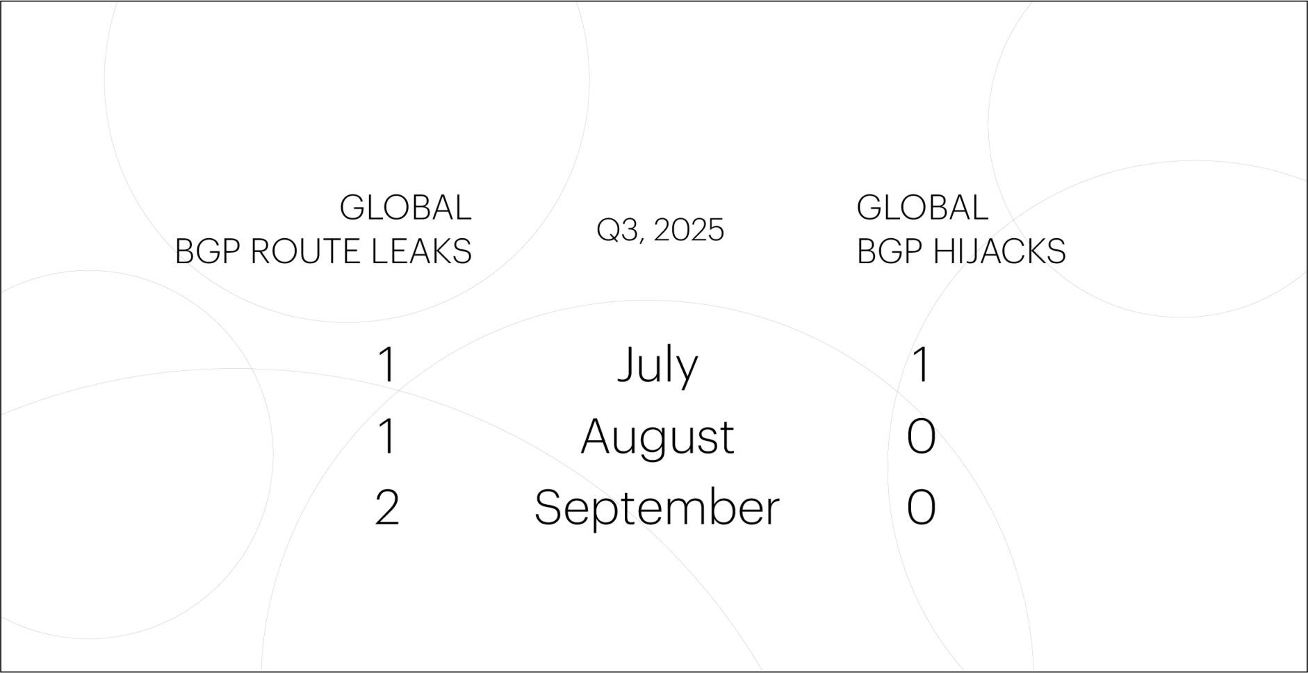 After the sharp surge in global BGP incidents reported in Q2 2025, Q3 was significantly calmer. During this period, we recorded only five global incidents — four route leaks and a single BGP hijack.